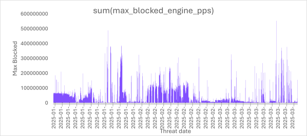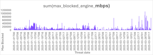 We automatically mitigated two attacks exceeding 1Tbps in the last week of Q1 2025. This milestone underscores the evolving threat landscape and the necessity for advanced, automated DDoS mitigation solutions to safeguard networks against increasingly massive attacks.